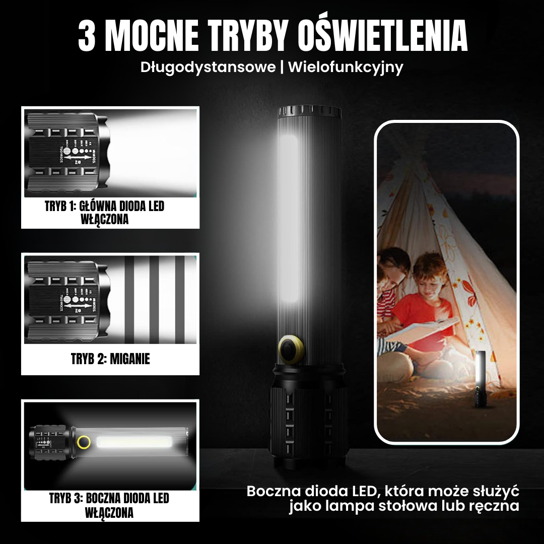 Trzy tryby taktyczne: Główne światło, boczne światło i migające SOS dla maksymalnej wszechstronności.